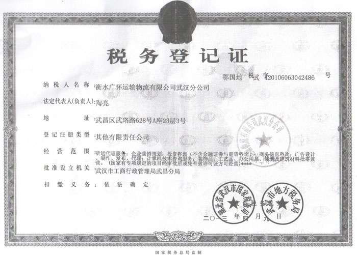 衡水广怀运输物流有限公司武汉分公司税务登记证